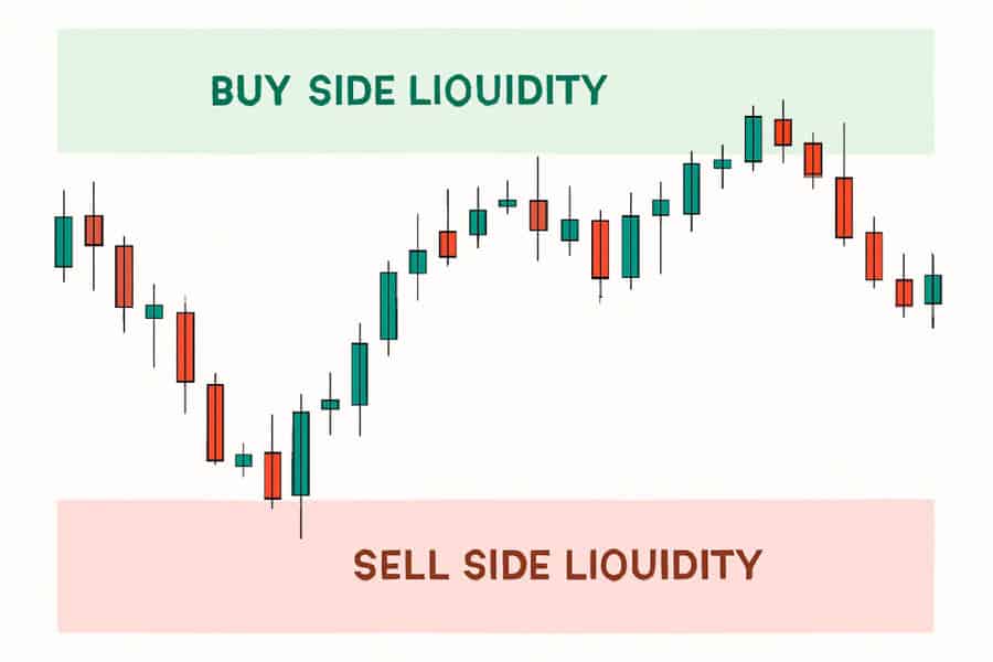 - Sell-Side Liquidity: Now, think of any obvious low, especially a “double bottom” or a clear support level. Below that low is a huge cluster of sell-stop orders (from people in buy trades). Price is drawn to these zones like a magnet.