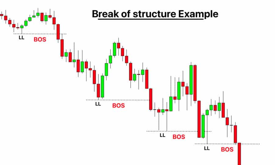 What it looks like: In an uptrend, a BOS occurs when price pushes decisively above the most recent higher high. In a downtrend, it’s when price breaks decisively below the most recent lower low. We’re generally looking for a candle body close beyond the level, not just a quick spike (wick).